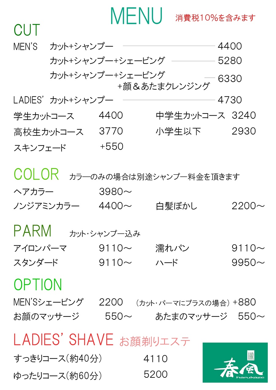 理容室、床屋、メンズカット(荒川区・町屋・荒川・尾久・東日暮里・三ノ輪)Hair(ヘア)春風(Harukaze)へようこそ